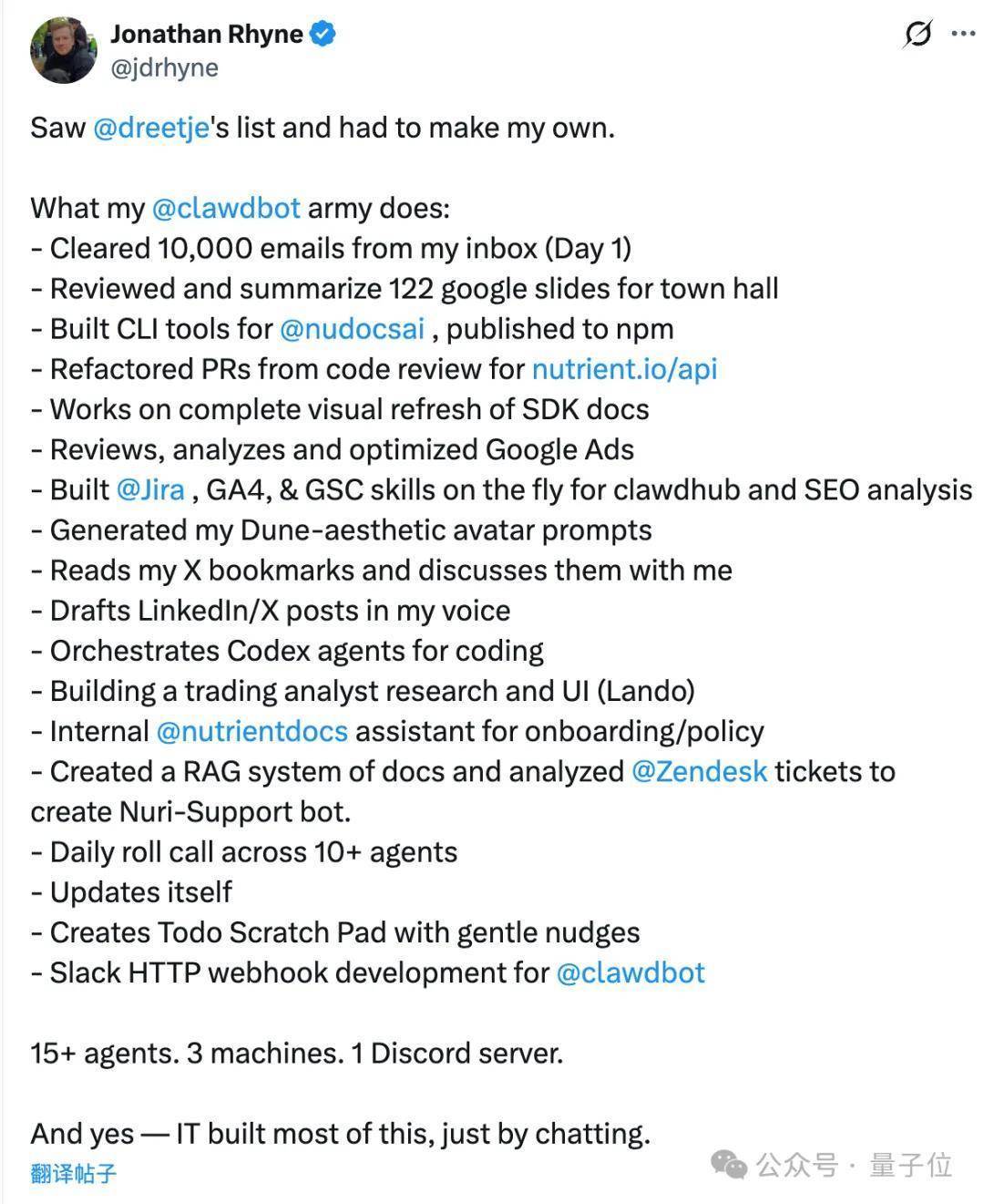 比如这位网友就用三台电脑、15个Agent部署了自己的“数字军团”,他只需要在一个Discord频道里坐镇指挥,就能让它们完成处理邮件、读PPT、写代码、发推文,甚至撰写每日汇报等一系列工作。